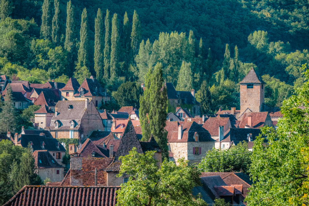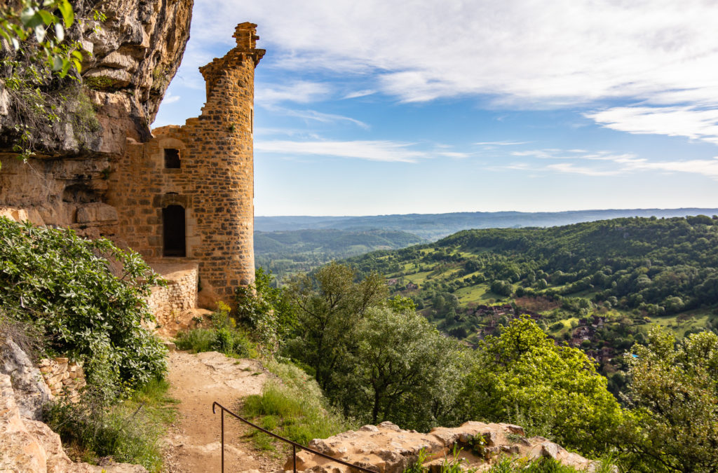 Helemaal beneden steken de rode daken af tegen het groen, liggen de tuinen rondom de oude huizen en strekt de vallei zich uit tot aan de plateaus van de Lot en de Dordogne. Een magisch panorama, dat je stil maakt. Dit is het hoogtepunt van de wandeling, dat je nog lang bijblijft.